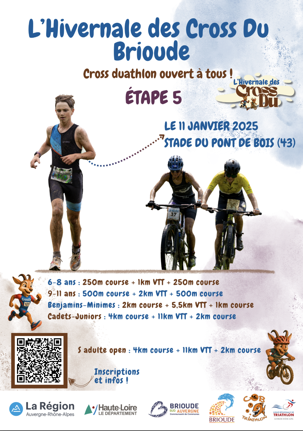 L'événement "cross duathlon de Brioude" est un duathlon qui aura lieu le dimanche 11 janvier 2026 dans le Haute-Loire.